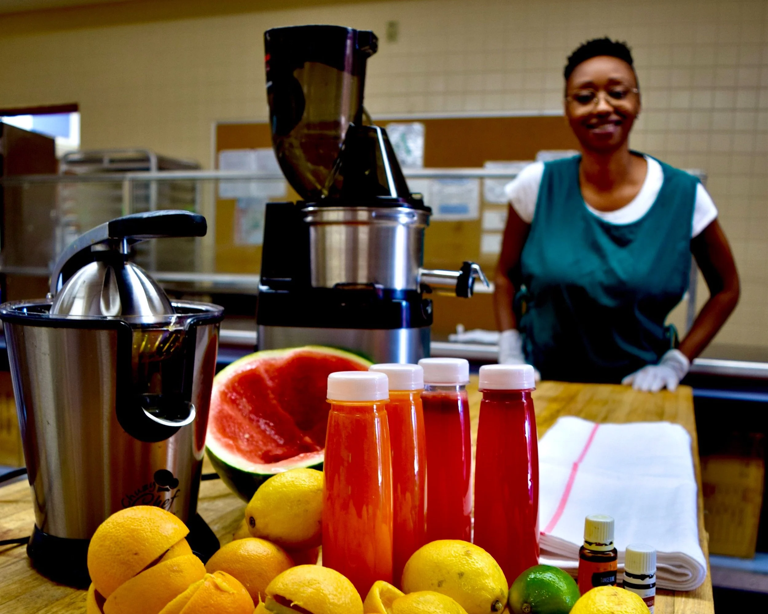 pictured: Keosha Brooks, owner of Fresh Peak Natural Juice, is one of the first entrepreneurs working in the G. Benjamin Brooks Academy community kitchen.